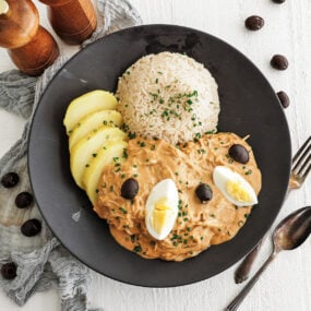 Aji de Gallina (pronounced ah-hee de gah-yee-nah) is a Peruvian chicken stew with a melting pot of influences from colonial Peru, Spain, Africa, and France. The name translates to “chicken with chili,” referencing its key ingredient, the ají amarillo pepper. It’s combined with braised chicken, bread, and chicken stock to become a rich, deeply comforting meal.
