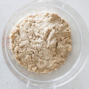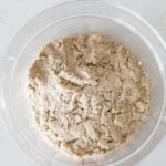 - Bring the shaggy dough together a bit more to form a sort of loose ball, then transfer it to a plastic container with a lid, or leave it in the bowl covered with plastic. Feel free to brush the container with a little oil.