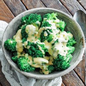 Plate and serve: I immediately strain the broccoli to stop the cooking process, then transfer it to a serving bowl. I spoon the warm cheese sauce over the top right before serving.
