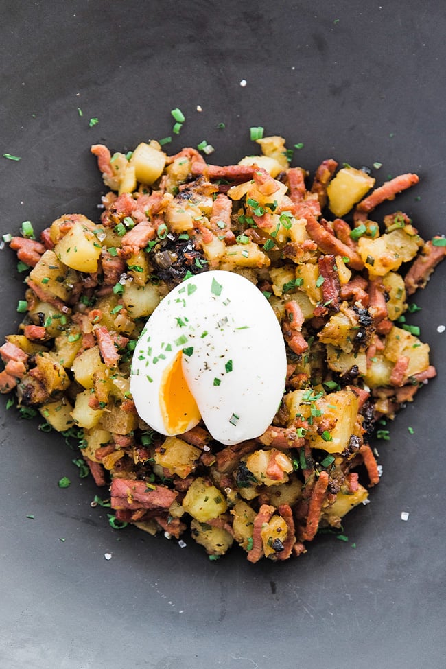 The jammy eggs on top are what really make this plate unique, and I learned the 6 minute egg technique from a three star Michelin chef at a demo I attended years ago in New York. You can use deli sliced corned beef if you do not have leftovers, or swap in pastrami, roast beef, or even bacon. If you are someone who believes breakfast should be the biggest meal of the day, grab your cast iron and let’s get cooking.