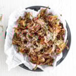 These Crispy Potato Skins are the perfect salty, cheesy snack for the big game. They’re quick and easy to make with only 3 ingredients, and you can customize them with any garnishes you like. I can never get enough when they’re topped with Parmigiano Reggiano and chives.