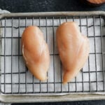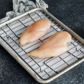 Prepare: First, I place the chicken breasts on a rack set over a sheet pan (or a plate).