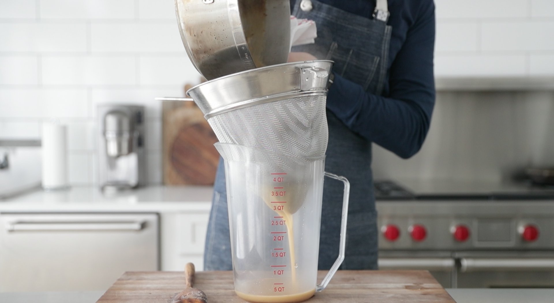 - Season with salt and pepper, and then strain the mixture through a chinois or fine mesh strainer and serve it.