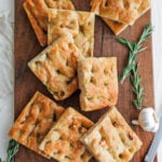 Bake and cool: I bake the focaccia until it’s deeply golden brown on top. Once it’s out of the oven, I transfer it to a cooling rack. I let it cool to room temperature before slicing.