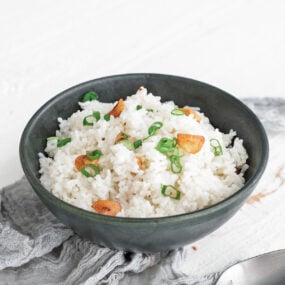 Garlic fried rice is one of those easy side dishes that goes well with pretty much anything. It absolutely makes the meal when I serve it with my favorite chicken inasal. When I want the whole Filipino-inspired experience, I’ll have a bowl of this rice on the table along with my saucy pork adobo, a big plate of bistek tagalog, or my fresh-but-filling classic pancit.