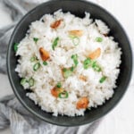 - Add more flavor: Minced onion or fresh ginger can be toasted with the garlic. Adding a splash of soy sauce, rice vinegar, fish sauce, or toasted sesame oil at the end will give the rice a nice boost of umami, too.