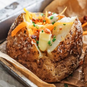 - Toppings – My favorite jacket potato toppings are butter, shredded cheddar cheese, sour cream, thinly sliced fresh chives, and chopped crispy bacon. You can find even more to choose from in the Serving Suggestions below.