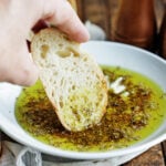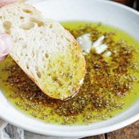 I almost always pair this easy olive oil dip with hard, crusty breads, such as ciabatta or baguette slices. The olive oil softens the bread perfectly and never makes it soggy. Softer breads, like dinner rolls or white sandwich bread, don’t work quite as well.