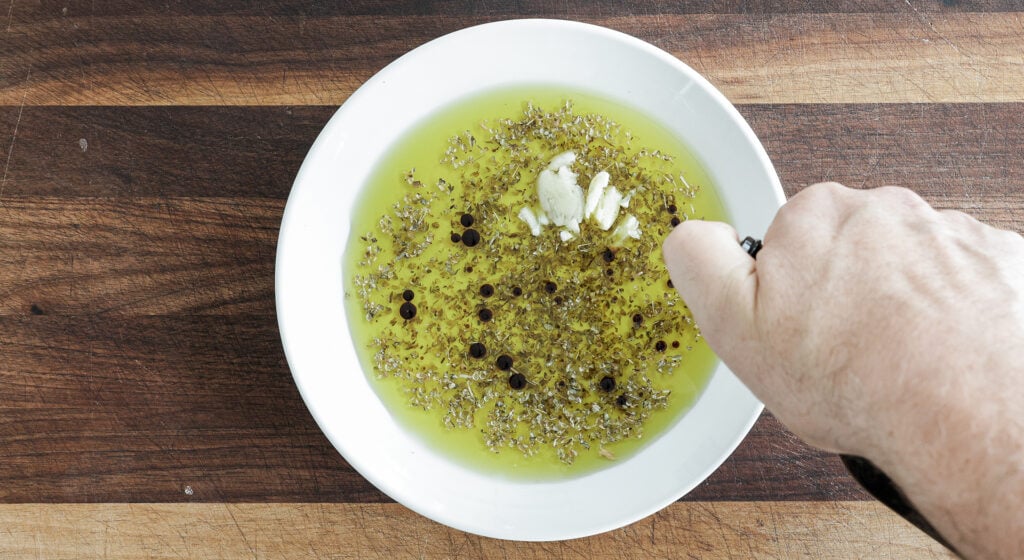 Mix the oil and seasonings: To start, I pour the olive oil over a small, shallow plate and then stir in the oregano, garlic, cheese, salt, and pepper.