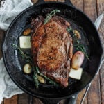 I like to remove the steak from the pan when it’s about 5 degrees away from medium rare because it will continue to cook slightly off the heat. If you realize you’ve cooked it a little too long, stand it upright on its side as it rests to help it cool down faster and stop the residual heat from cooking it even further.