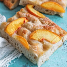 This Peach Focaccia puts a summery twist on the classic Italian bread. The soft, fluffy, and olive oil-soaked bread is topped with juicy peaches and caramelized sugar for the perfect balance of sweet and savory. This is one of my favorite homemade loaves to make when stone fruit is at its peak.