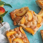 I like to slice peach focaccia into rectangles and enjoy it plain or drizzled with honey, maple syrup, or balsamic reduction for a sweet snack or appetizer. You can even serve it for breakfast with strawberry jelly or apricot jam.