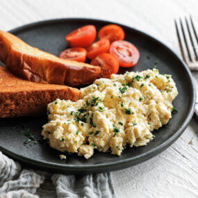 I like to making these creamy eggs and serving them as a scrambled egg toast on Saturday mornings. They’re mouthwatering on their own, but get even better with fresh chives and a few ribbons of smoked salmon or prosciutto on top.