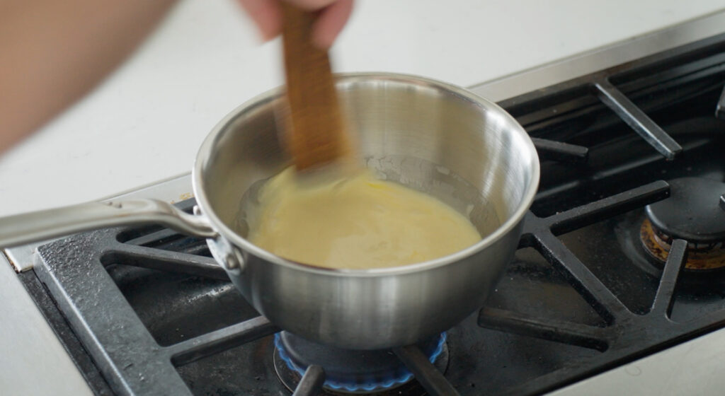Melt: I melt the butter in a pan over low to medium heat. I don’t want it to melt as soon as it hits the pan. A slow, even melt with no sizzling is the goal.