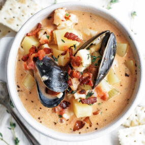 Compared to other chowders, seafood chowder is a catch-all. Manhattan chowder skips cream entirely and uses a bright tomato broth; Rhode Island chowder is clear and briny; and beloved New England clam chowder is thick and creamy. My seafood chowder has a similar cozy style, but with way more variety.