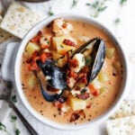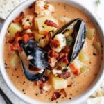 This easy Seafood Chowder features generous portions of white fish, shellfish, and potatoes in a rich, velvety broth. It’s one of those creamy comfort foods I can’t get enough of.