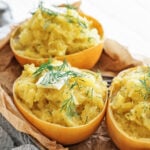 Roasted spaghetti squash is an easy side dish flavored with melted butter, fresh dill, and simple seasonings. I love how the oven does most of the work and how I can customize the flavors based on what I’m in the mood for. For extra fun, I served the tender squash in their hollowed-out shells.