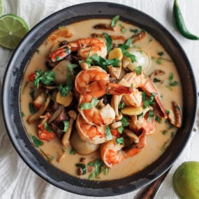 Tom yum is Thailand’s national soup, and for good reason. This iconic Thai dish is celebrated for its bright, spicy, and aromatic broth, traditionally made with simple ingredients like shrimp, wild mushrooms, chile peppers, and herbs. I make it every time I want something satisfying and comfortably spicy, though you can make it as mild or as fiery as you like.