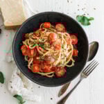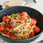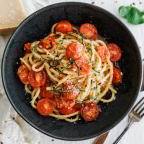 I make this pasta pretty much year-round, but especially when those late-summer tomatoes are popping up everywhere. I love seeing them blister in the hot pan and how the juices add garden-fresh flavors to the simple pasta sauce. Basil leaves, melted Parmigiano-Reggiano, and a splash of the reserved pasta cooking water bring the rest of the dish together.