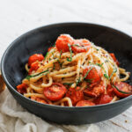 Basil and tomato pasta is one of those pasta recipes you can make in what feels like 2 seconds, and that’s all thanks to a handful of ingredients. I kept this dish as classic as it gets, using these straightforward but delicious ingredients.